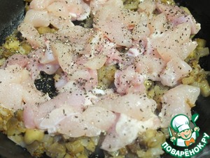 В конце жарки добавляем порезанную на небольшие кусочки курицу, тушим все вместе 5-7 минут.
