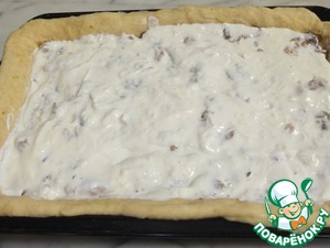 Для заливки смешиваем сметану, йогурт, чеснок, пропущенный через пресс и сыр, натертый на мелкой терке.