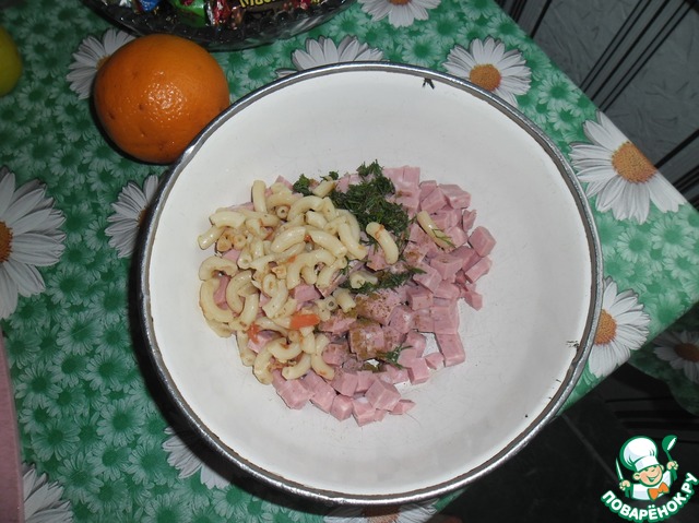 • Колбасу нарезаем кубиками. Мелко рубим укроп, добавляем черный молотый перец. Все перемешиваем. (У меня еще немного отваренных макарон было, я их тоже закинула.)))