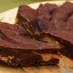 Сверху вылить оставшуюся шоколадную массу и быстро обратной стороной ложки сделать мраморный рисунок.