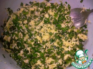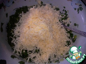 Выложить тертый сыр в миску с зеленью и яйцами.