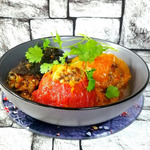 Начиняем полученным фаршем овощи. Выкладываем их в большую ёмкость. Я взяла чугунок. Можно и в сотейник... -