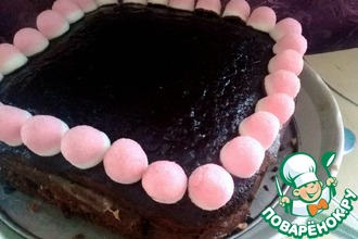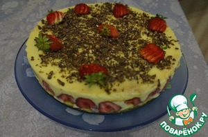 Через 8 часов. Достаем торт с формы. Посыпаем тертым шоколадом и украшаем клубникой.