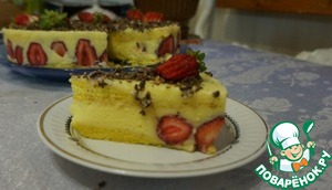 Залить немного кремом. Целую клубничку выкладываем следующим образом (на фото). И заливаем кремом так, чтобы клубничка "потонула в нем".