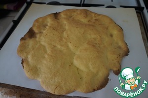 Отсоединяем корж от бумаги, ставим сверху форму и по ее бортикам обрезаем края коржа, так чтобы вышел ровный круг.