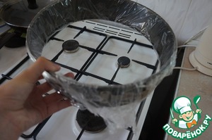 Края формы оборачиваем пищевой пленкой. На дно кладем первый корж и смыкаем формой.