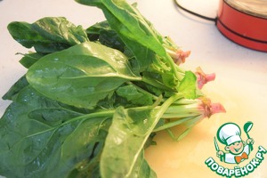 Шпинат промыть, отрезать корешки.