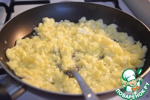 На хорошо разогретую сковороду с растительным маслом (масла можно не жалеть) выложить яйца. Интенсивно их помешивая, подождать, пока они свернутся.