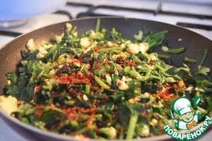 Добавить шпинат и протушить на большом огне (корочка не должна образовываться) минуты 3, всё время помешивая. Для тех, кто любит остренькое, можно добавить красный перец в хлопьях. Соль при жарке не добавляем (соль была только в воде)!
