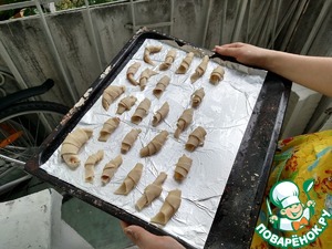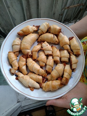 Приготовим тесто. Смешаем муку+дрожжи+сахар+те плая вода+кусочками размягченное масло. Вымешиваем тесто 5 минут, формируя шар. Оставляем наше тесто на 15 минут под полотенцем в теплом влажном месте. Формируем треугольнички, кладем начинку и сворачиваем от более широкой стороне к узкой. Выкладываем на противень.