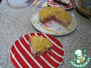 Последний маленький шар теста, тонко раскатываем, и выпекаем его так, чтобы его можно было-бы измельчить в крошку (как для Наполеона), Посыпаем верх крошкой, включая (по-возможности) и бока. Закрываем пластиковой крышкой и ставим на несколько часов в холодильник для пропитки. У меня простоял 3 часа. Режем на 8 частей, но у меня муж любит большие порции, я порезала на 4 части.