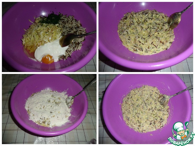 В рабочую чашку выкладываем рис, кабачок, яйцо, 3 ст. л. сметаны, укроп. Солим. Перемешиваем. Добавляем муку. Хорошо перемешиваем.