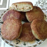 Разогреть растительное масло на сковороде, выкладывать картофельную массу столовой ложкой, на нее начинку