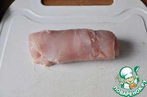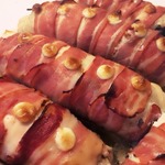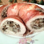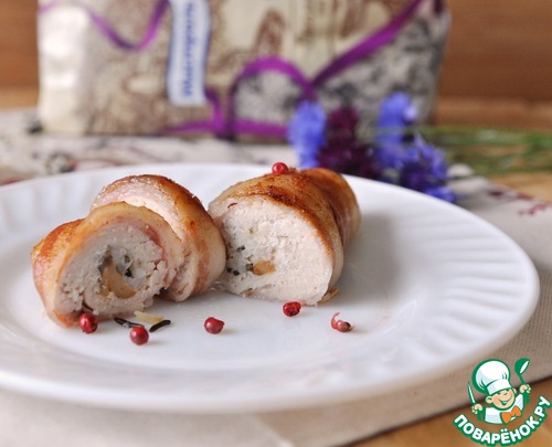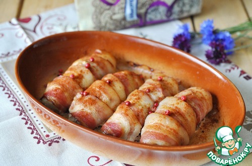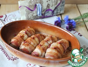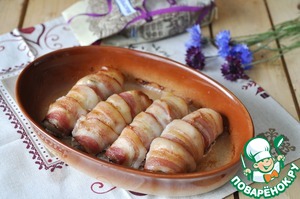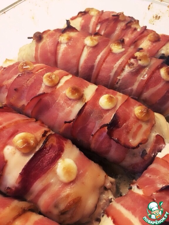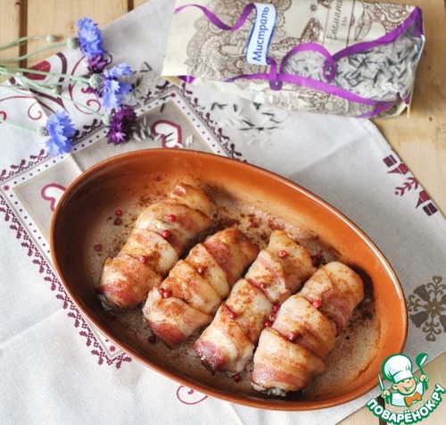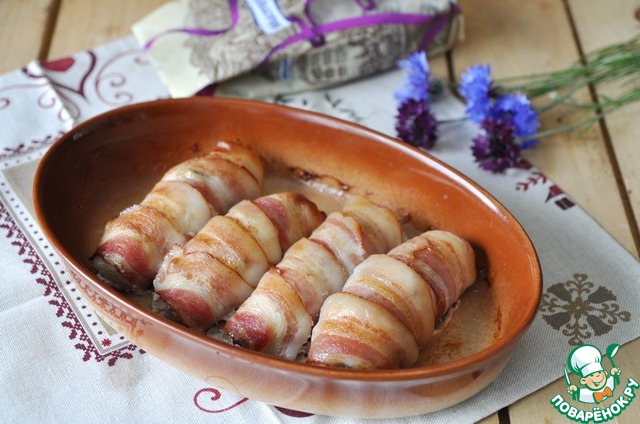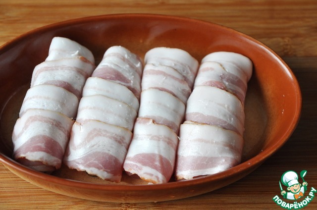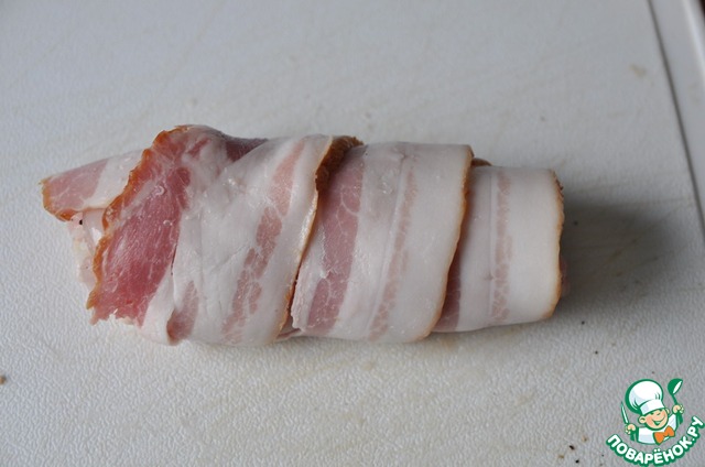 Сверху рулетик обматываем в нахлёст полосками бекона. На один рулетик может уйти 2-3 полоски.