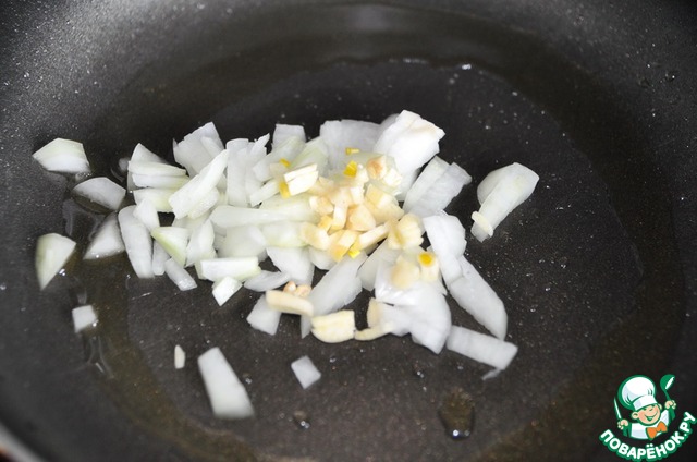 Мелкими кубиками режем лук, чеснок и обжариваем на сковороде.
