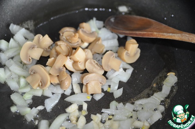 Добавляем порезанные шампиньоны, у меня варёные, можно брать любые грибы. Обжариваем до румяности, солим, перчим.