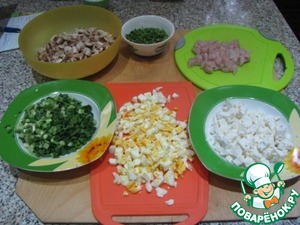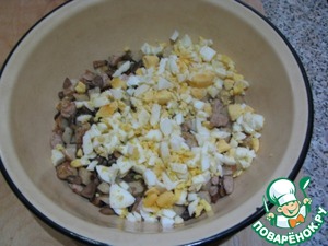 3 яйца отварить и мелко порубить. В отдельную миску выложить грибы с курицей, добавить рубленные яйца.