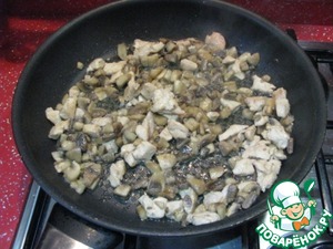 Порезать кубиками шампиньоны (или любые другие грибы). добавить к грудке и обжарить все вместе, с добавлением сливочного масла. Немного масла оставить для смазывания готового горячего пирога.