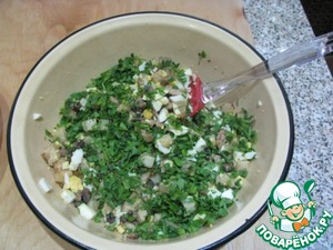 Мелко порезать петрушку и выложить также в миску, все перемешать.