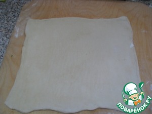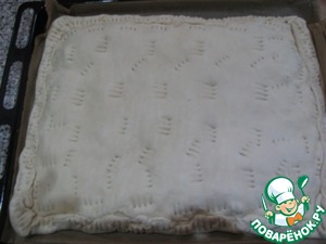 Тесто разморозить к этому времени, в соответствии с инструкцией, раскатать по размеру вашего противеня.