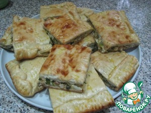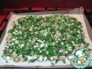 Застелить пекарской бумагой противень и перенести раскатанное тесто. Выложить равномерно подготовленную начинку (без лука). Сверху обильно посыпать мелко нарезанный зеленый лук.