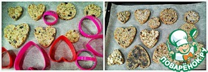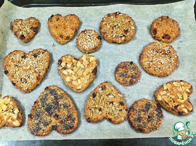 Печенье выкладываем на противень, застеленный пергаментной бумагой. Можно просто ложкой выложить. Мне захотелось сделать так. Взяла формочки, положила на противень и внутрь ложкой положила тесто, разровняла аккуратно и убрала формочку. Сверху посыпьте тем, что есть под рукой. Я для наглядности посыпала: кунжутом, маком, семечками, кокосовой стружкой и миндальной стружкой. Выпекаем в заранее разогретой духовке 15-20 минут при температуре 200 градусов.