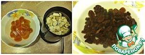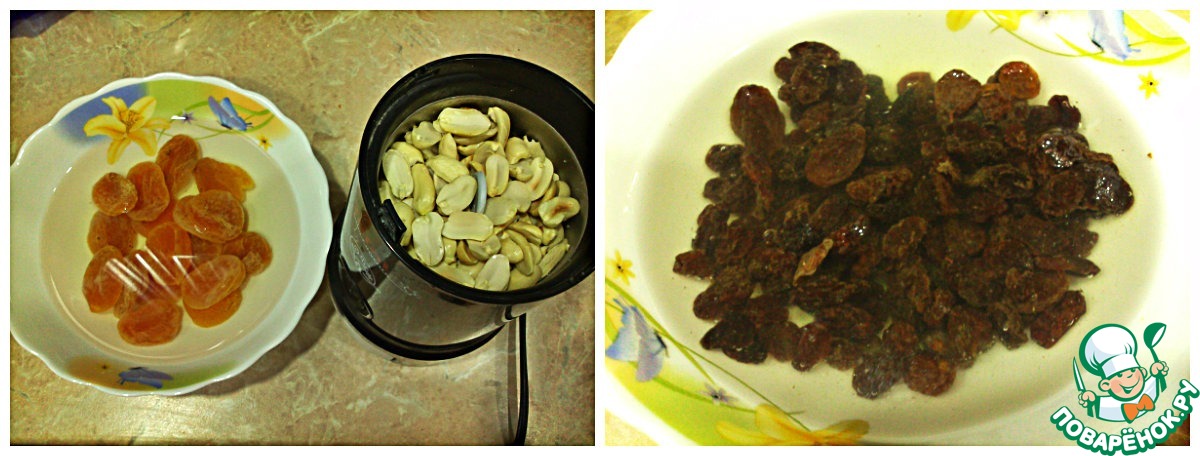 Курагу и изюм промыть, залить водой и дать постоять минут 10. Затем слить воду и измельчить курагу. Орехи очистить и измельчить в кофемолке или любым другим способом.