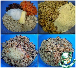 В емкости соединить изюм, курагу, орехи, хлопья, сахар, мягкое сливочное масло (или растительное) и все тщательно перемешать. Далее добавить киноа, муку и перемешать. Яйцо взбить, добавить к тесту и перемешать. Тесто готово. Тесто должно быть густым, не должно растекаться, должно держать форму. Если получилось не густое, добавьте еще муки.