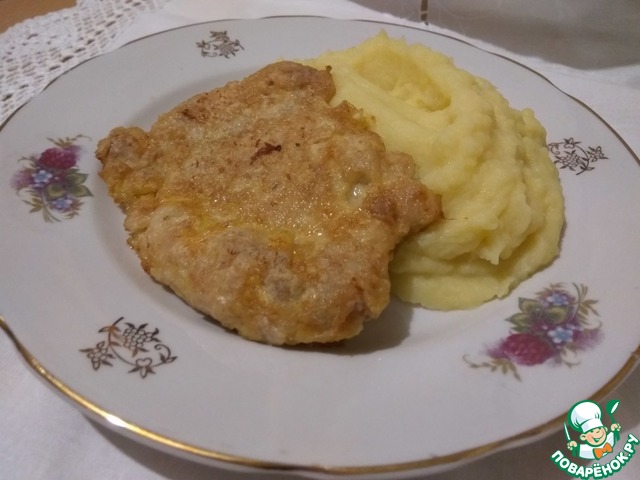Мясо макаем в муку, потом в яйцо и выкладываем на сковороду.