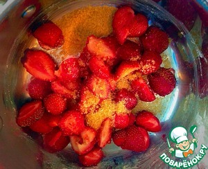 Если клубника крупная, то можно порезать ее на половинки. Выкладываем ее в сотейник или кастрюлю с толстым дном. Засыпаем 2 ст. л. коричневого сахара и отправляем на средний огонь. Наша цель дождаться полного растворения сахара. Клубнику лучше не мешать иначе получится клубничная каша, а нам нужна клубника в соусе.