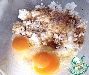 Далее к творогу добавим яйцо, сахар коричневый, соль и ванильную эссенцию. Перемешать все и взбить миксером до однородной консистенции.