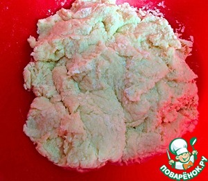 Далее добавим в мучную смесь половину яично-творожной и вымешаем тесто до однородности. -