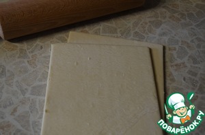 В это время разморозить слоеное тесто. Пласты теста положить друг на друга и раскатать на слегка посыпанной мукой рабочей поверхности в прямоугольник. Белок взбить и смазать им раскатанное тесто. Противень смазать или выложить бумагой для выпечки. Нагреть духовку до 200 градусов.