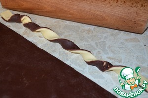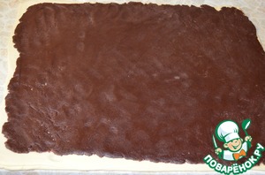 Шоколадное песочное тесто распределить ровным слоем на слоеном тесте и хорошо прижать.