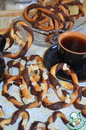 Смешать сахарную пудру с 2 ст/л горячей воды. Смазать полученной глазурью горячие крендельки и сразу же посыпать миндальными хлопьями.