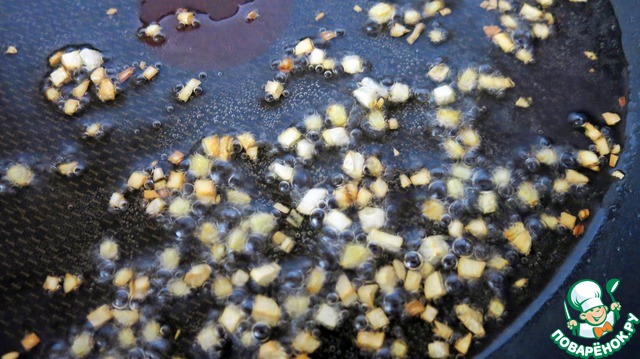На сковороду наливаем растительное масло, кладем половину (!) чеснока и имбиря, обжариваем их до хрустящей корочки и выкладываем в чашечку.