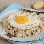 Всё! Все составляющие блюда - готовы! Порционно выкладываем рис, сверху кладем яйцо и посыпаем хрустящим чесноком с имбирем. Любители остренького могут посыпать ещё перцем чили. Наш "Имбирный жареный рис с яйцом" - готов!