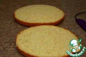 Берем разьёмную форму или кольцо для зборки торта, застилаем пищевой плёнкой чтоб свисали концы, кладём на дно нижний корж,