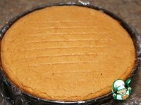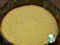 Берем разьёмную форму или кольцо для зборки торта, застилаем пищевой плёнкой чтоб свисали концы, кладём на дно нижний корж, |