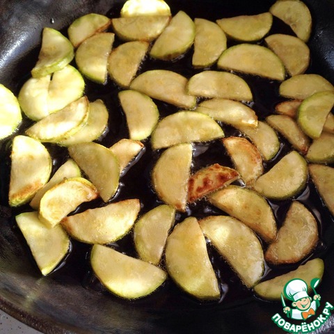 1. Нарезать цуккини, обжарить во фритюре до золотистой корочки и выложить на бумажные полотенца, чтобы стекло лишнее масло.