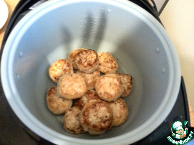 Затем на дно нашей мультиварки, у меня Поларис, наливаем подсолнечное масло, чтоб чуть покрыло дно и выкладываем наши котлетки к дну ближе той стороной которая менее зажарилась.