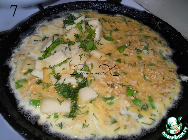 Вылить содержимое на разогретую сковороду, на половину блина положить сыр кусочки (можно натереть на крупной терке) и мелко порубленную зелень.