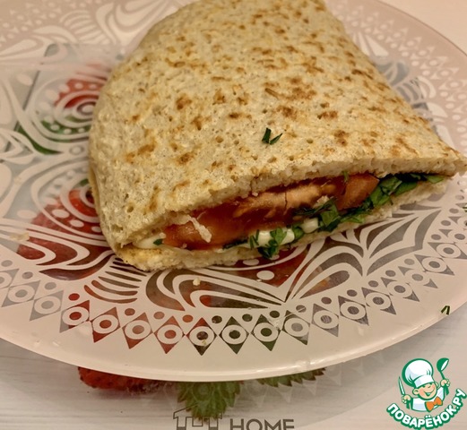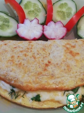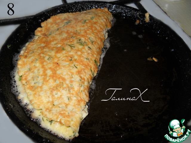 Нагреть сковороду, залить смесью. Дать немного приготовиться, на половинку блина кладём начинку.