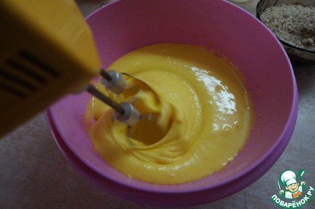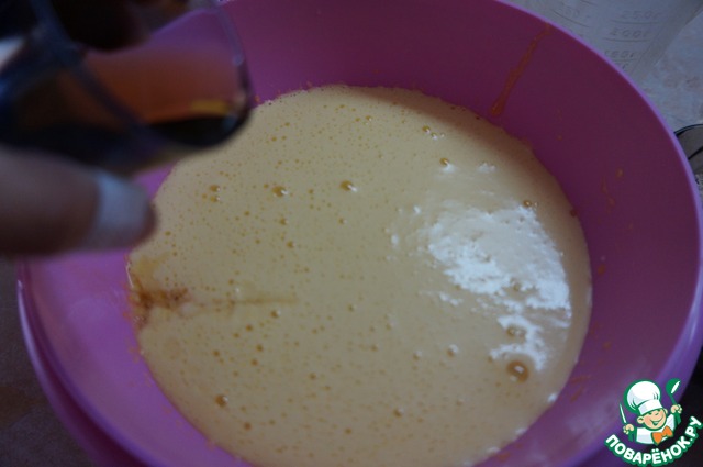 Просеянную муку, частями добавляем в яичную массу, и перемешиваем.