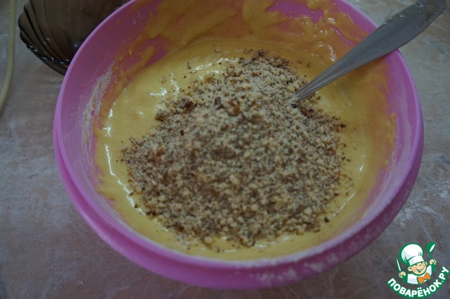 Соду гасим уксусом, добавляем в тесто. Орехи измельчаем при помощи блендера или скалки и всыпаем в тесто, перемешиваем.
