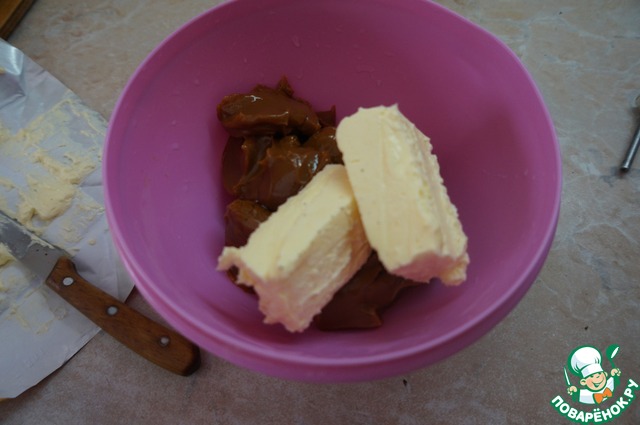 Сгущенку взбиваем с масло и орехами.