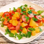 Минут через 10 добавить к кабачкам порезанные кубиками помидор и сосиски. Посолить. Тушить до полной готовности. Подавать можно как в горячем, так и в холодном виде.