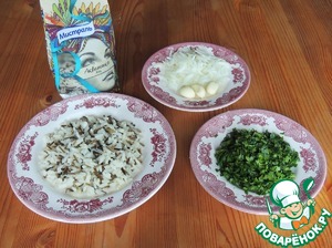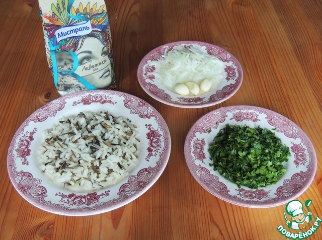 Рис "Акватика микс" ТМ "Мистраль" (с добавлением дикого риса) отварить по инструкции; для салата потребуется около 1 стакана готового риса. Лук порезать перьями, чеснок измельчить. Мелко нарезать большой пучок петрушки (можно использовать кинзу).