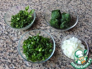 Измельчить лук и петрушку. Обжарить репчатый лук на небольшом количестве растительного масла до прозрачности. Добавить размороженный шпинат (можно взять свежий), зеленый лук и петрушку, прогреть.
