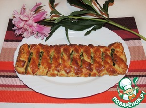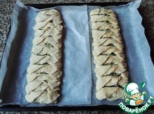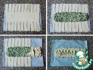 Тесто разморозить. Формировать пироги лучше сразу на пергаменте для выпечки. Каждую пластину раскатать до размера примерно 28х33 см (до увеличения площади вдвое). Края пластины надрезать на полоски по 3 см шириной. В середину выложить начинку. Каждые две полоски теста связывать узлом, расправляя кончики в одну сторону (за идею формовки благодарю Гульнару Закирову).